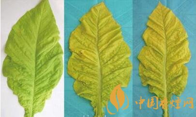 煙葉達到成熟時,葉面的綠色逐漸消退,黃色程度增加,稱為“落黃”。下部煙葉落黃成熟,葉尖和葉邊緣為黃色,整個葉面為綠黃色。中上部葉或比較厚的葉片成熟時,葉面為淺黃至淡黃色,有黃色至黃白色成熟斑,葉尖和葉緣為黃白色。