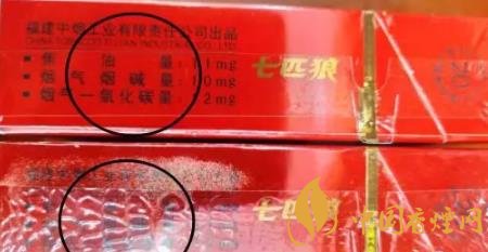 1、商標(biāo)紙上的“七匹狼”商標(biāo)圖案:真煙套印準(zhǔn)確,燙金飽滿,色澤鮮亮,圖案生動(dòng),立體感強(qiáng)。假煙燙金套印容易出現(xiàn)錯(cuò)位,燙金處會(huì)出現(xiàn)漏金現(xiàn)象,顏色相較真煙暗沉,立體感差。(左真右假)