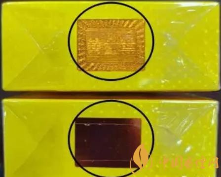3、煙盒頂部防偽標(biāo)識(shí):真煙在不同角度可見黃金葉文字與圖案相互變換。假煙未能顯現(xiàn)真煙防偽標(biāo)識(shí)的效果,或者文字與圖案層疊無法清晰分離。(上真下假)