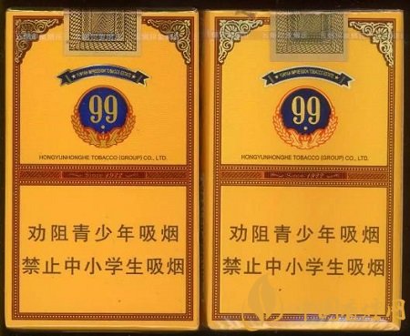 真煙:1.橫幅圖案邊框呈金色,底紋有網(wǎng)格狀。2.中間“99”圖案,整體偏藍(lán)色,色彩過(guò)度自然,呈現(xiàn)中心淺外圍深漸變效果。(左真右假)