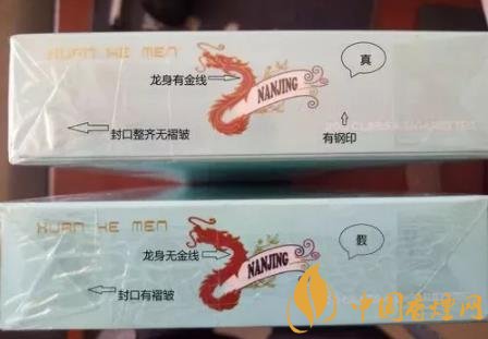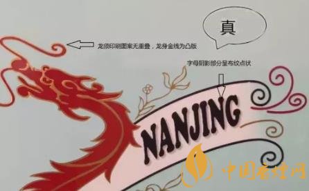 看條盒顏色,真煙為淡藍色,顏色柔和純正;假煙為淺藍色,視覺上顏色不是自然色。看條盒圖標(biāo),真煙“南京”二字字體端正清晰,龍須印刷圖案無重疊,龍身金線為凸版,條盒金邊無毛刺;假煙“南京”二字字體向左微傾,龍須有疊痕錯層,龍身顏色為褐紅色、金線為凹版,條盒金邊有毛刺。