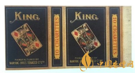 二十世紀(jì)三十年代,南洋兄弟煙草公司出品了“王牌”卷煙。這張煙標(biāo)長(zhǎng)146MM,寬74MM。“王牌”即“KING”,撲克牌“K”牌面。該卷煙標(biāo)正版與副版的圖案一模一樣,煙標(biāo)中央向左傾斜45度的一張方塊“K”撲克牌,其上寫有大大的金色英文字母“KING”,其下為南洋兄弟煙草公司出品的英譯文。整幅煙標(biāo)沒有一個(gè)中文字,左右騎縫處則各印有紅色的“10 CIGARETTES”,即該卷煙規(guī)格為十支裝。方塊“K”牌面,就是凱撒大帝(朱利葉斯·凱撒),為羅馬共和國(guó)終生的執(zhí)政官,后出任高盧總督。四張花色的“K”牌面,南洋公司為何只取其方塊花色呢?因?yàn)樵谒膹埢ㄉ?ldquo;K”中,只有這張方塊“K”為凱撒大帝手持戰(zhàn)斧的側(cè)面像,其余三張人物均為正面像。可能廠商是為了標(biāo)新立異,從中亦能投射出其生產(chǎn)的卷煙與眾不同吧。如此設(shè)計(jì)的煙標(biāo),握于手掌,更像是拿了一副撲克牌,雌雄難辨,頗有玩味。