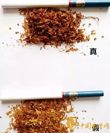 真品卷煙的煙絲由葉絲組成,煙絲切絲均勻,光澤油潤性好,碎末少,顏色為檸檬黃;假冒卷煙的煙絲由碎梗、碎絲組成,工藝粗糙,煙絲寬度不均勻、多為碎末,經(jīng)硫磺熏制后呈黃白色。