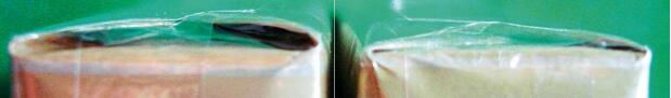 2.看小盒底部包裝紙,真煙包裝紙折角處呈現(xiàn)弧狀,且間隙較大;而假煙的底部包裝紙折角處呈銳角,而且間隙比較小。肉眼可直接對比出來。