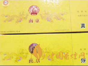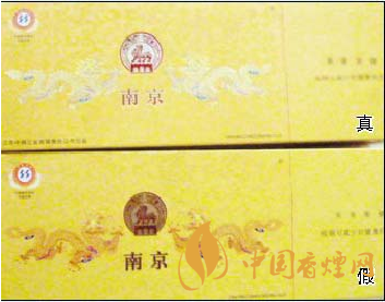 真煙條盒正面的“雙龍”、“南京”等圖案的立體感強,摸上去凹凸感明顯,底色為明黃色;假煙的“雙龍”、“南京”等圖案大都無凹凸感,底色呈黃色。